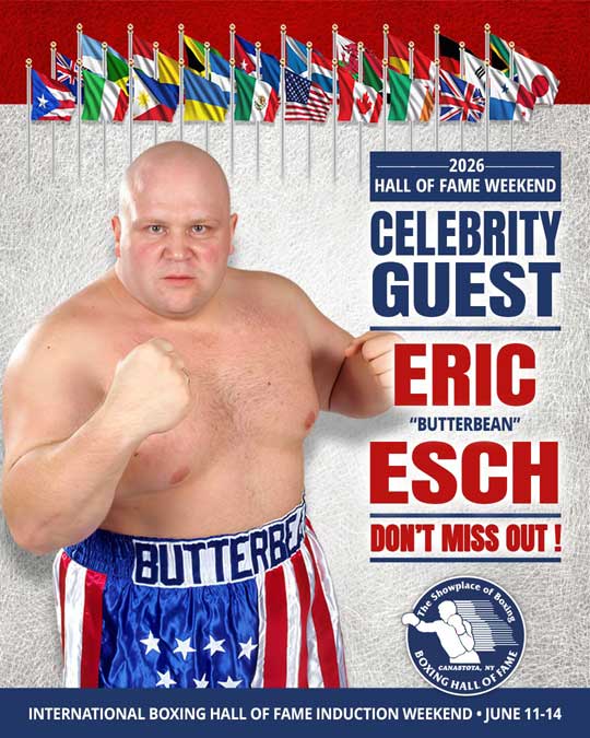 In addition to Butterbean, an impressive array of boxing stars from around the world are set to be in Canastota including Marco Antonio Barrera, Mikey Garcia, Michael Spinks, Christy Martin, Erik Morales, Timothy Bradley Jr., Winky Wright, Jim Lampley, Kelly “The Ghost” Pavlik, Vinny Paz, Kenny Bayless, “Jesse” James Leija, Jorge Linares, Buddy McGirt, Ray Mercer and Ruben Olivares.