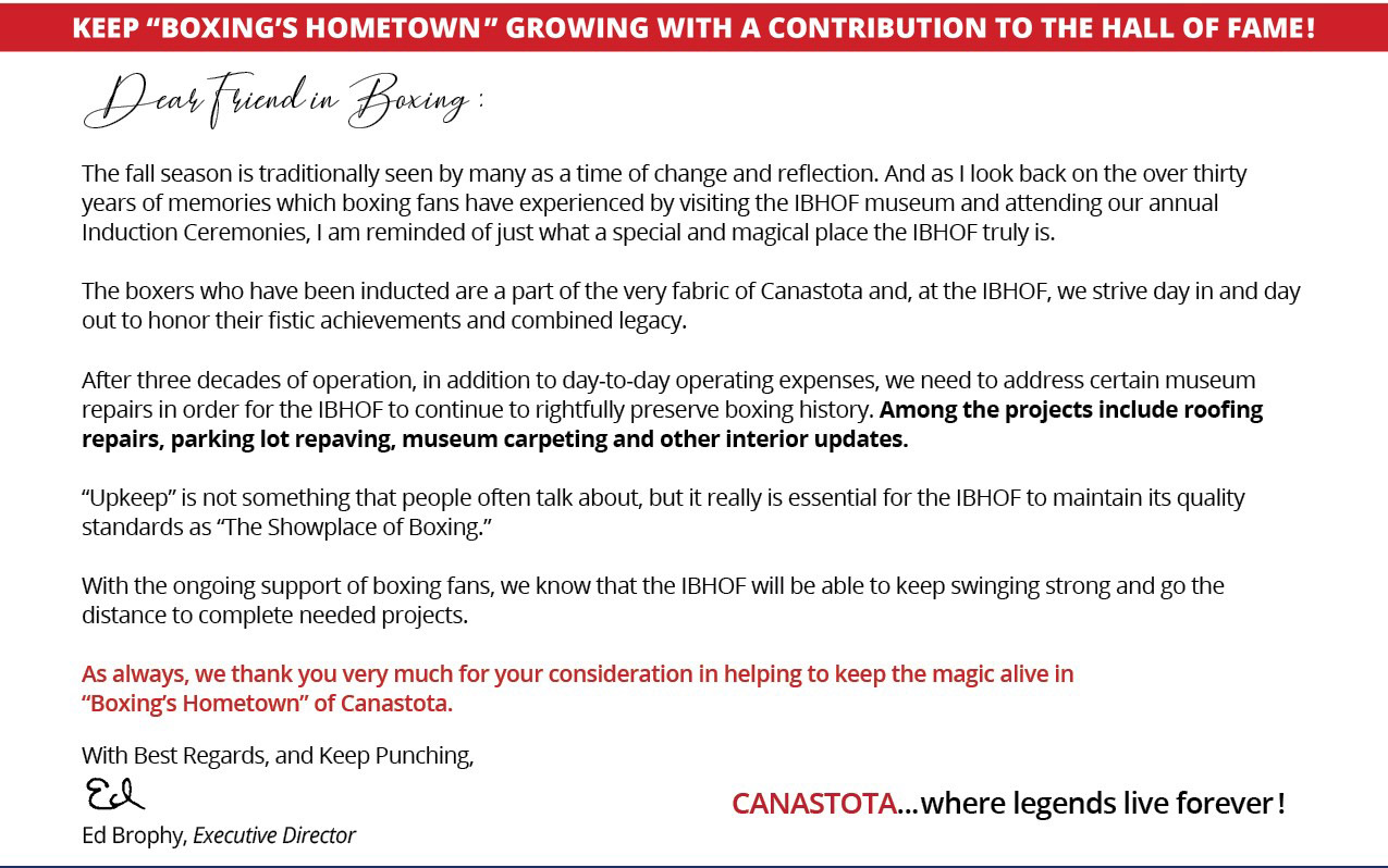 International Boxing Hall of Fame 1 Hall of Fame Drive Canastota, NY 13032 P: 315.697.7095 F: 315.697.5356