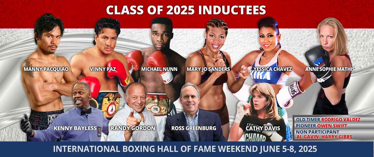 The Class of 2025 to be honored includes boxers Manny Pacquiao, Vinny Paz, Michael Nunn, Yessica, Chavez, Anne Sophie Mathis, Mary Jo Sanders, Cathy “Cat” Davis, Rodrigo Valdez (posthumous), Owen Swift (posthumous), referee Kenny Bayless, cut man Al Gavin (posthumous), referee Harry Gibbs (posthumous), broadcaster / journalist Randy Gordon and television producer Ross Greenburg.