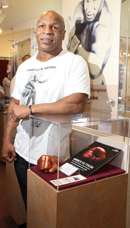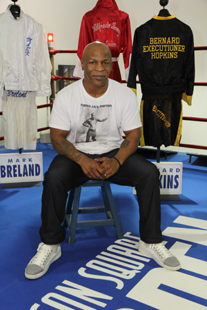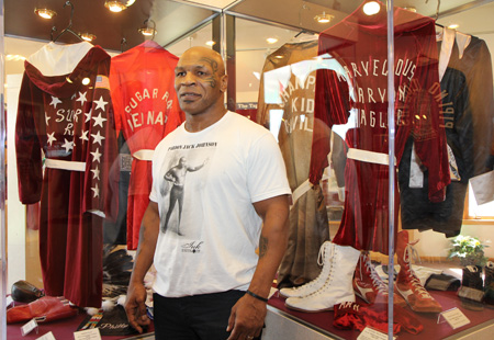 On the afternoon of his first promotional event, Tyson visited the Hall of Fame for a walk down boxing’s memory lane. As he stopped by each exhibit, Tyson, who is a historian of the sport, offered insights into the lives and ring achievements of many legendary Hall of Famers including Lou Ambers, Jimmy McLarnin, Ike Williams, Joe Gans, Harry Greb, Jack Dempsey, Benny Leonard and Jem Belcher. Sporting a “Pardon Jack Johnson” t-shirt, the youngest heavyweight champion in history also toured the Hall’s research library and enjoyed perusing the ever-expanding collection of newspapers, magazines and books chronicling boxing history from the bare-knuckle era to the modern day. “Iron” Mike, who fought in Madison Square Garden three times as a professional, also stepped back into the world famous 82-year old MSG ring, which is now on permanent display in the Hall of Fame.